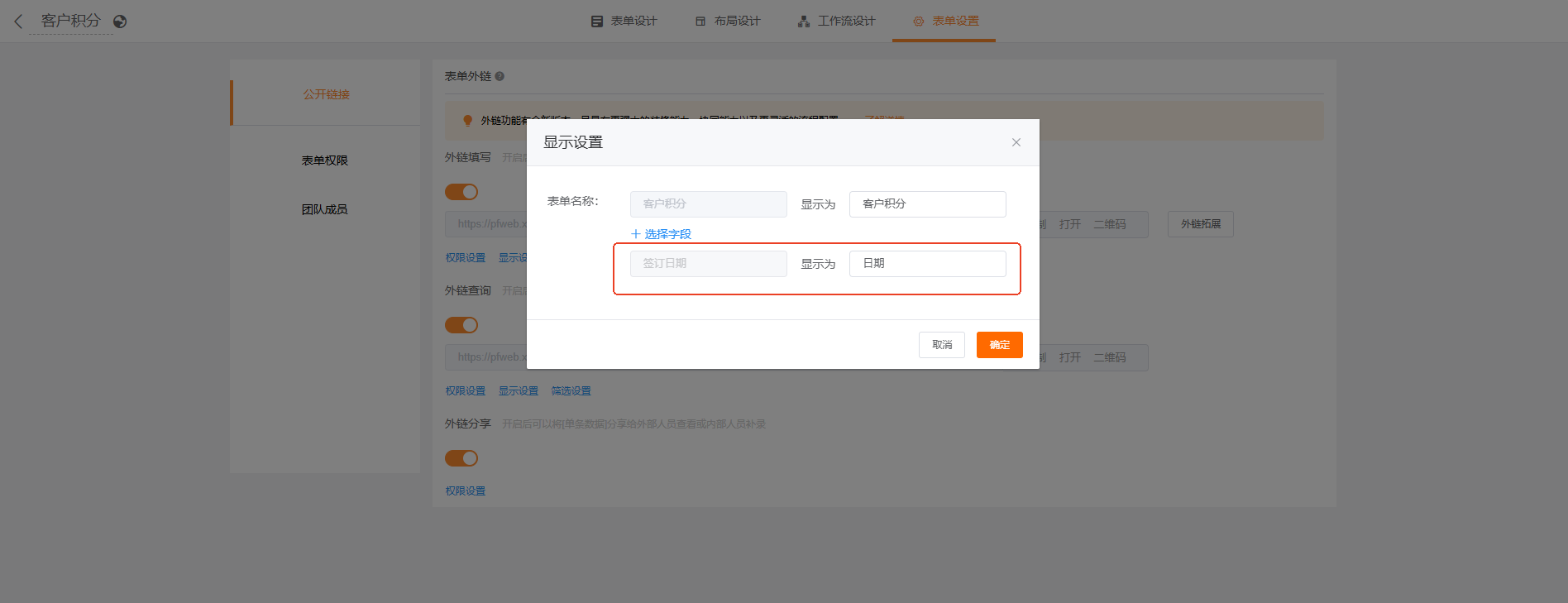 查询的表单链接支持设置哪些字段对外可见。一张表单部分字段外部人员不方便看到的,可以设置为不可见
