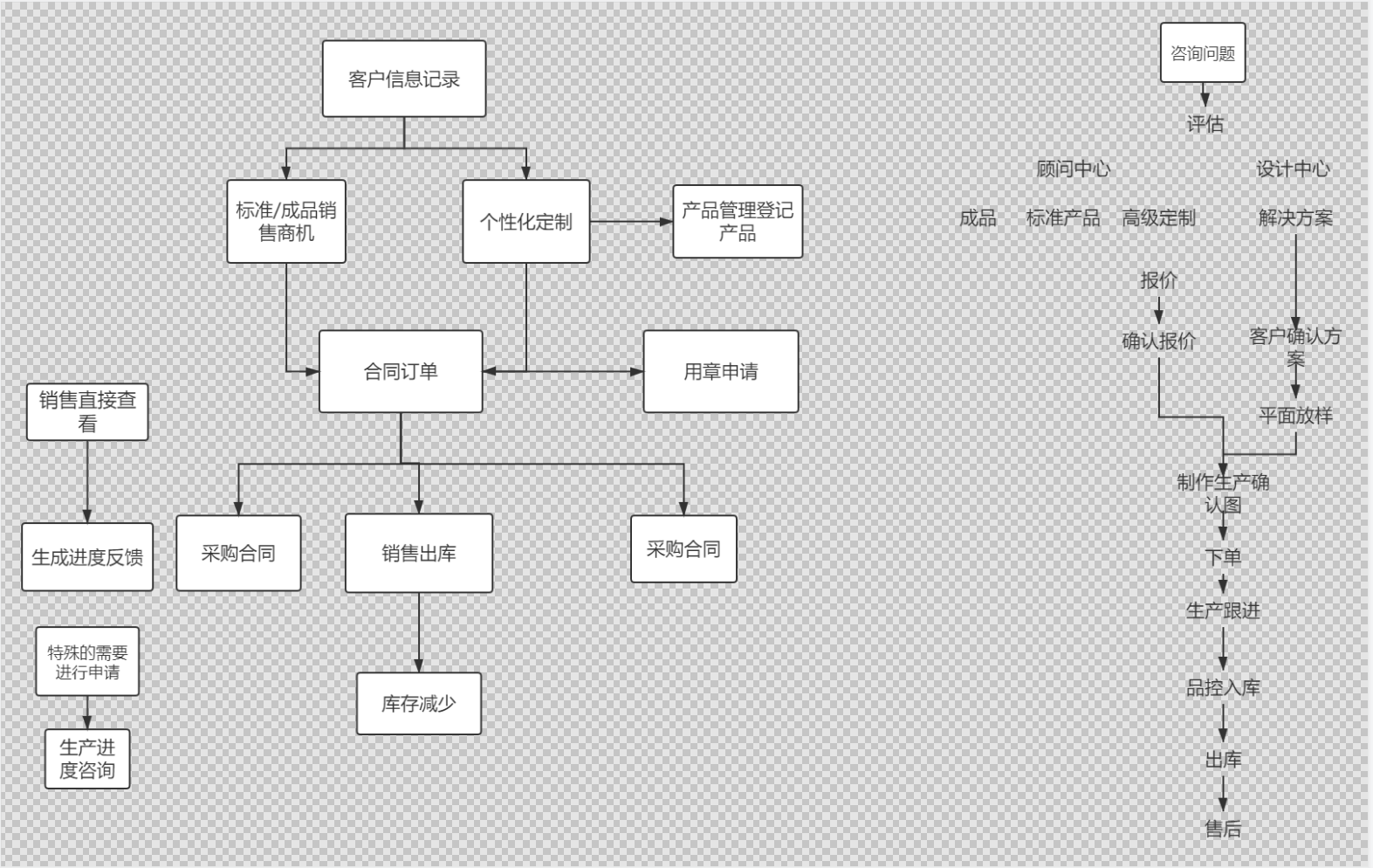 客户咨询–确认方案、报价–制作生产确认图–下订单-生产–出库–售后
