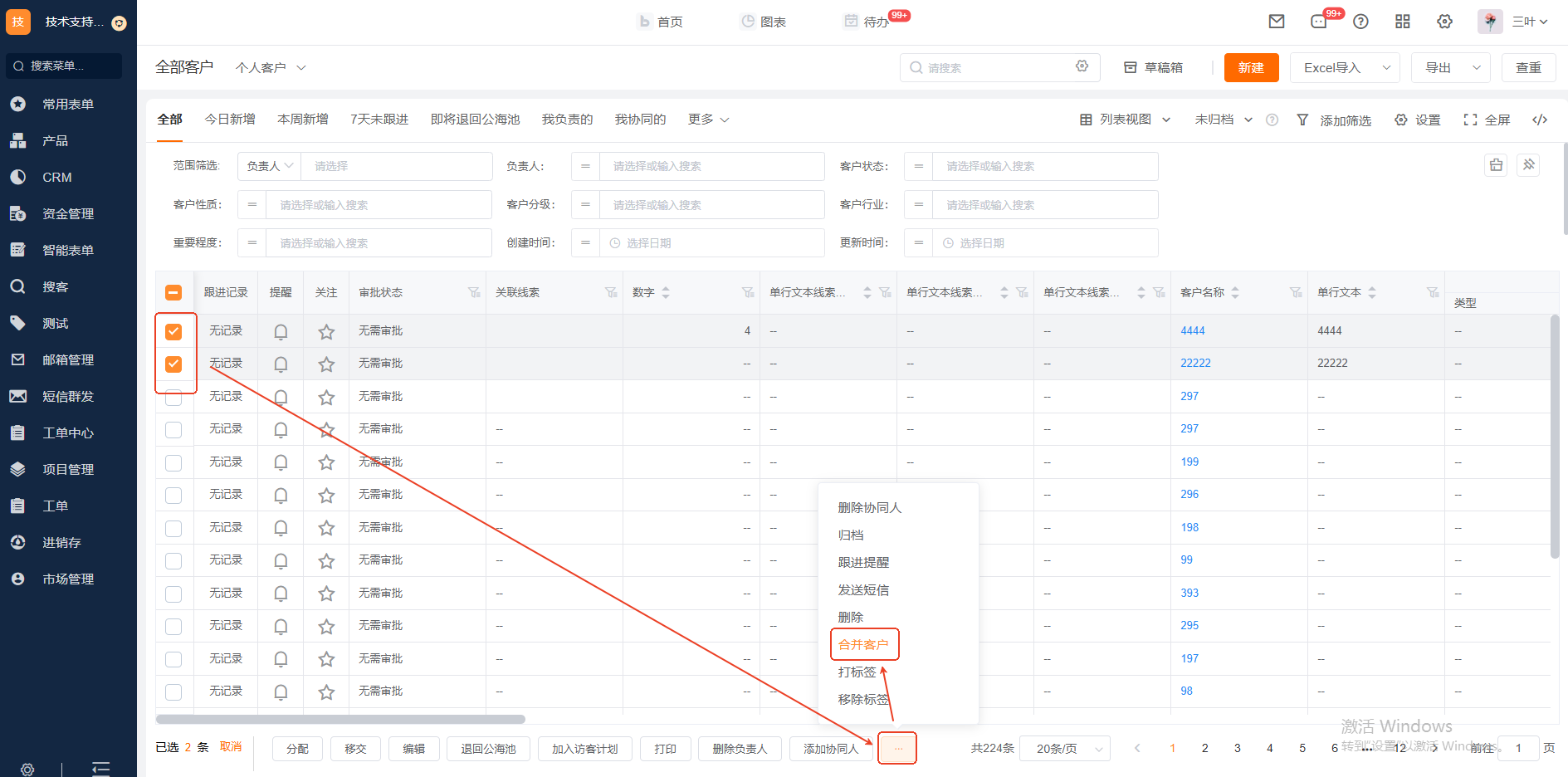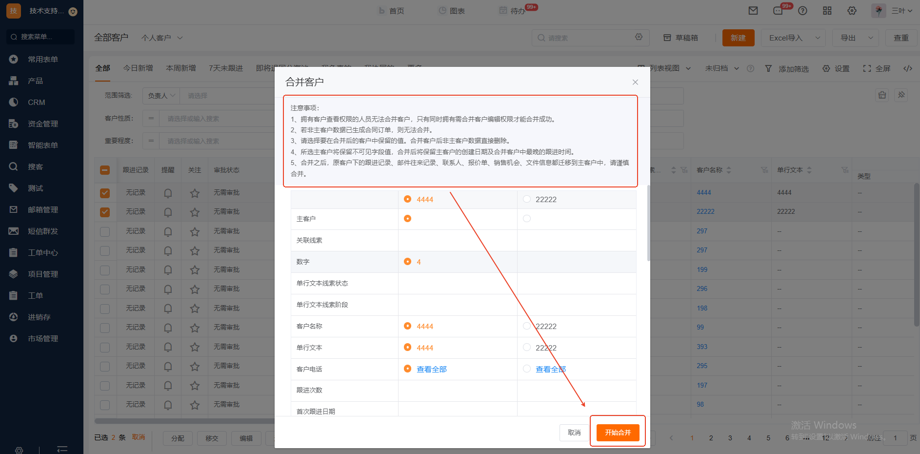 如何进行客户合并操作? Q:如何进行客户合并操作 【场景】 因客户名称填写不规范或其他原因,可能需求对两个或多个客户进行合并操作,以实现精简数据的目的。 【操作方法】 在CRM 》客户管理 》全部客户 》勾选两个客户,在底部批量操作位置点击合并客户 【注意事项】 1、拥有客户查看权限的人员无法合并客户,只有同时拥有需合并客户编辑权限才能合并成功。 2、若不是作为主客户数据的客户下已生成合同订单,则无法合并。 3、请选择要在合并后的客户中保留的值。合并客户后非主客户数据直接删除。 4、所选主客户将保留不可见字段值,合并后的客户中将保留最早的创建日期及最晚的跟进时间。 5、合并之后,原客户下的跟进记录、联系人、报价单、销售机会、文件信息都迁移到主客户中,请谨慎合并。