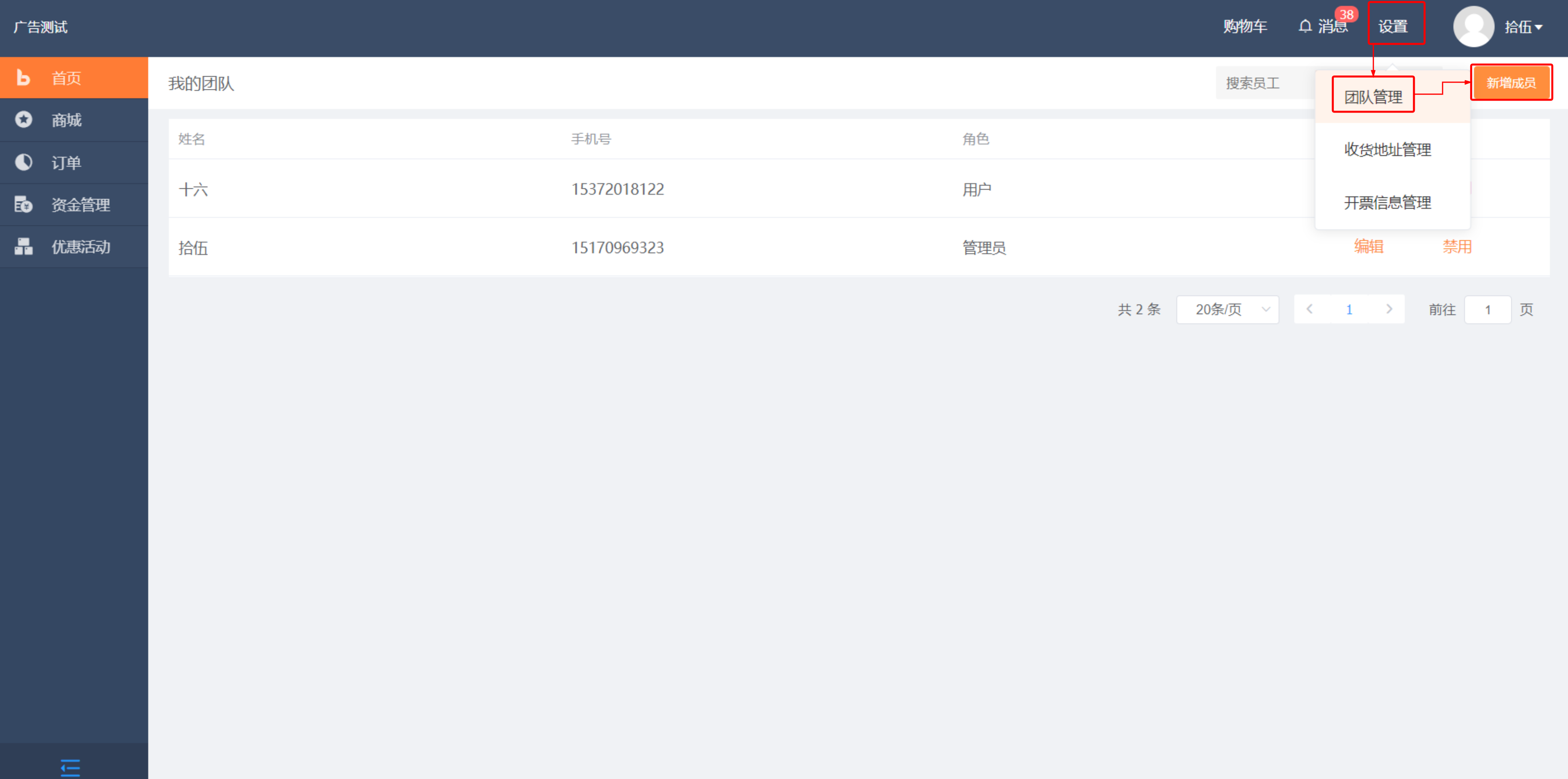 团队管理;经销商管理员可以自行添加和编辑公司员工账号,会同步到厂商,对应的员工可以在系统里下单。