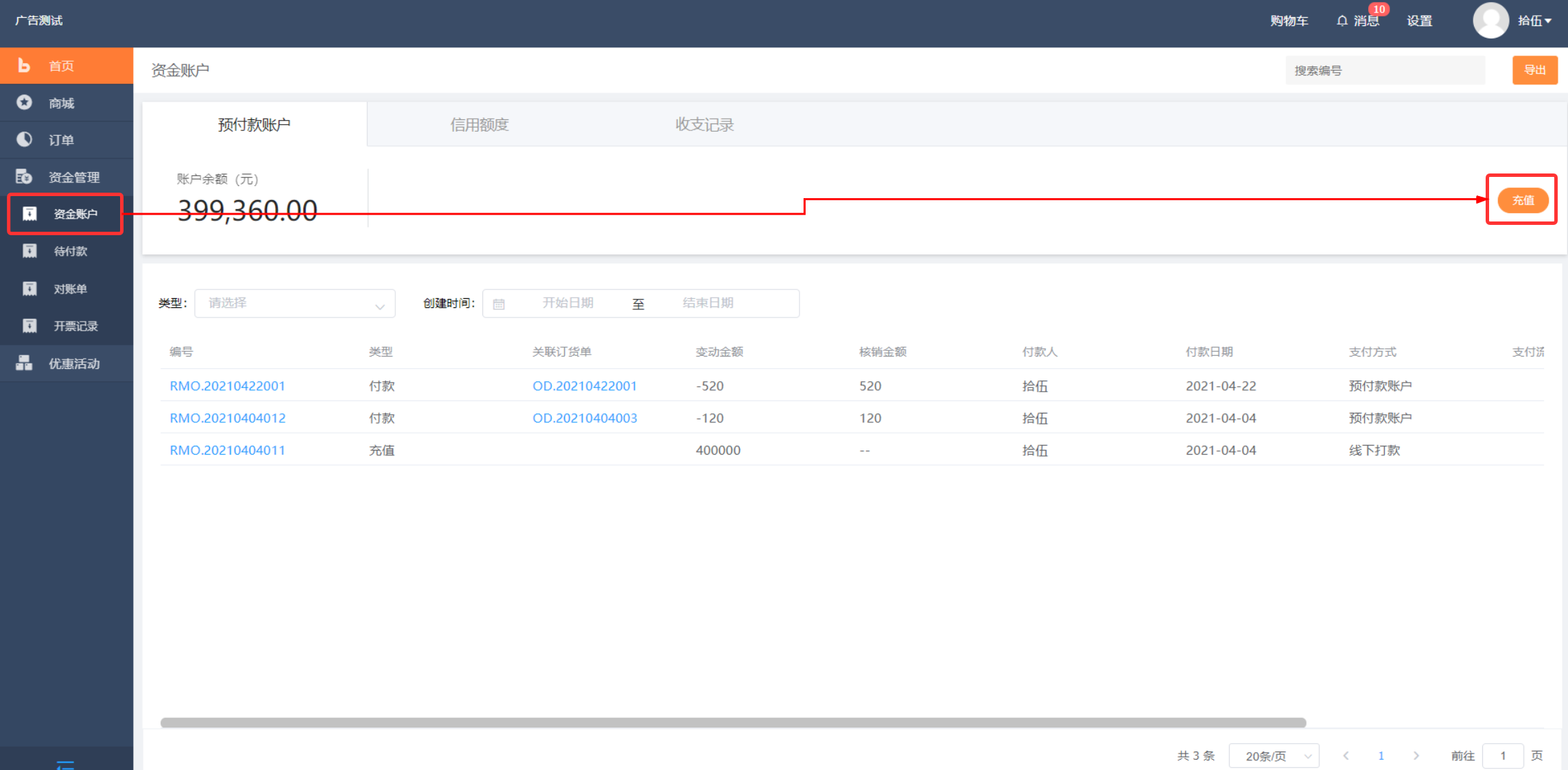 操作入口: 资金管理 》资金账户 》预付款账户》点击充值