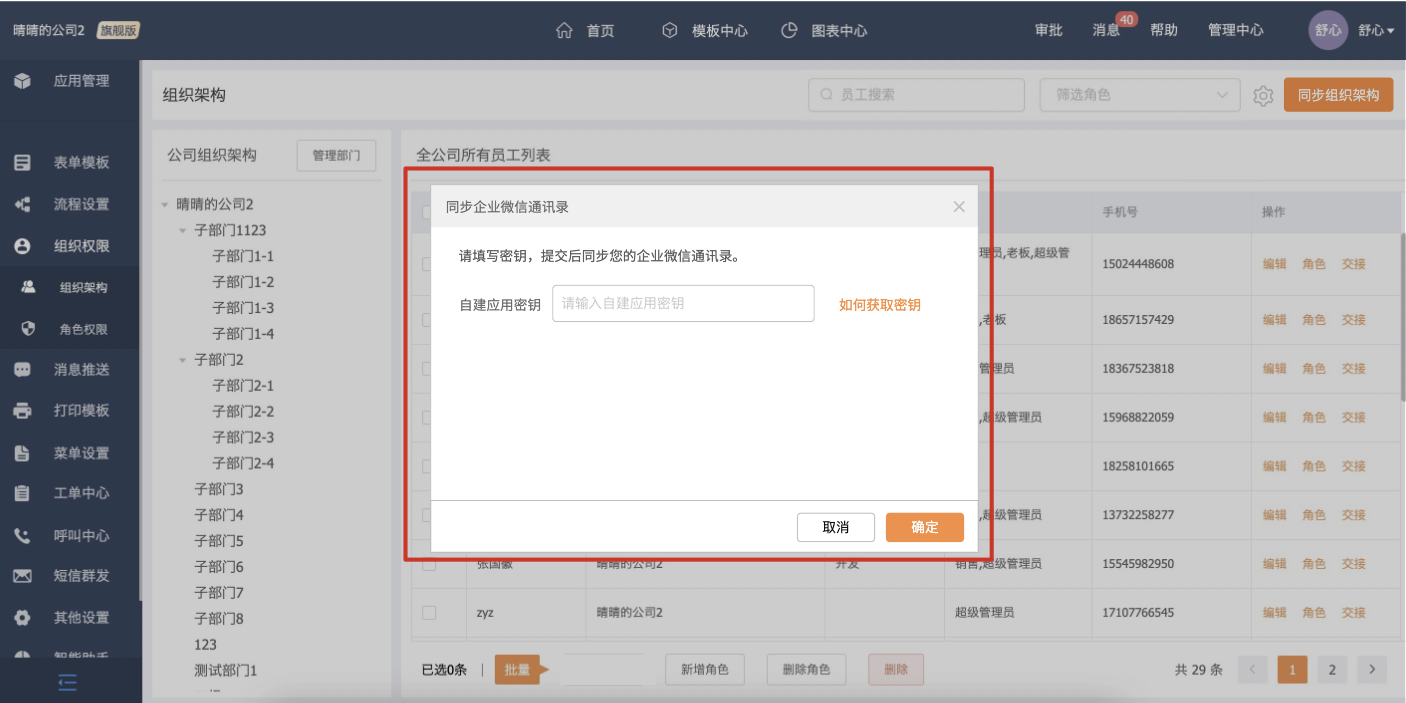 应用场景:如密钥发生修改或在初次使用时未绑定自建应用,则需通过管理中心-组织架构-设置-修改密钥