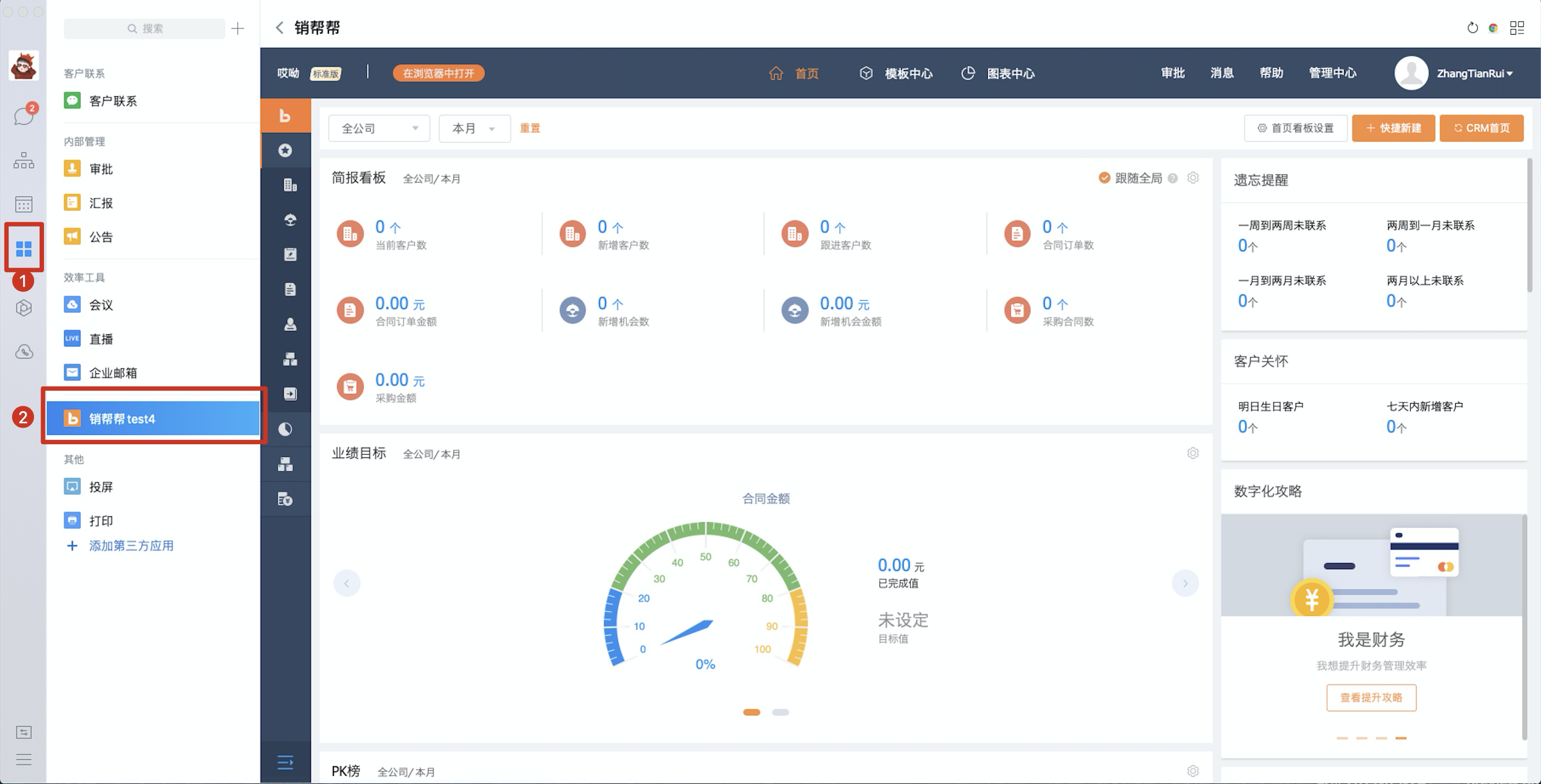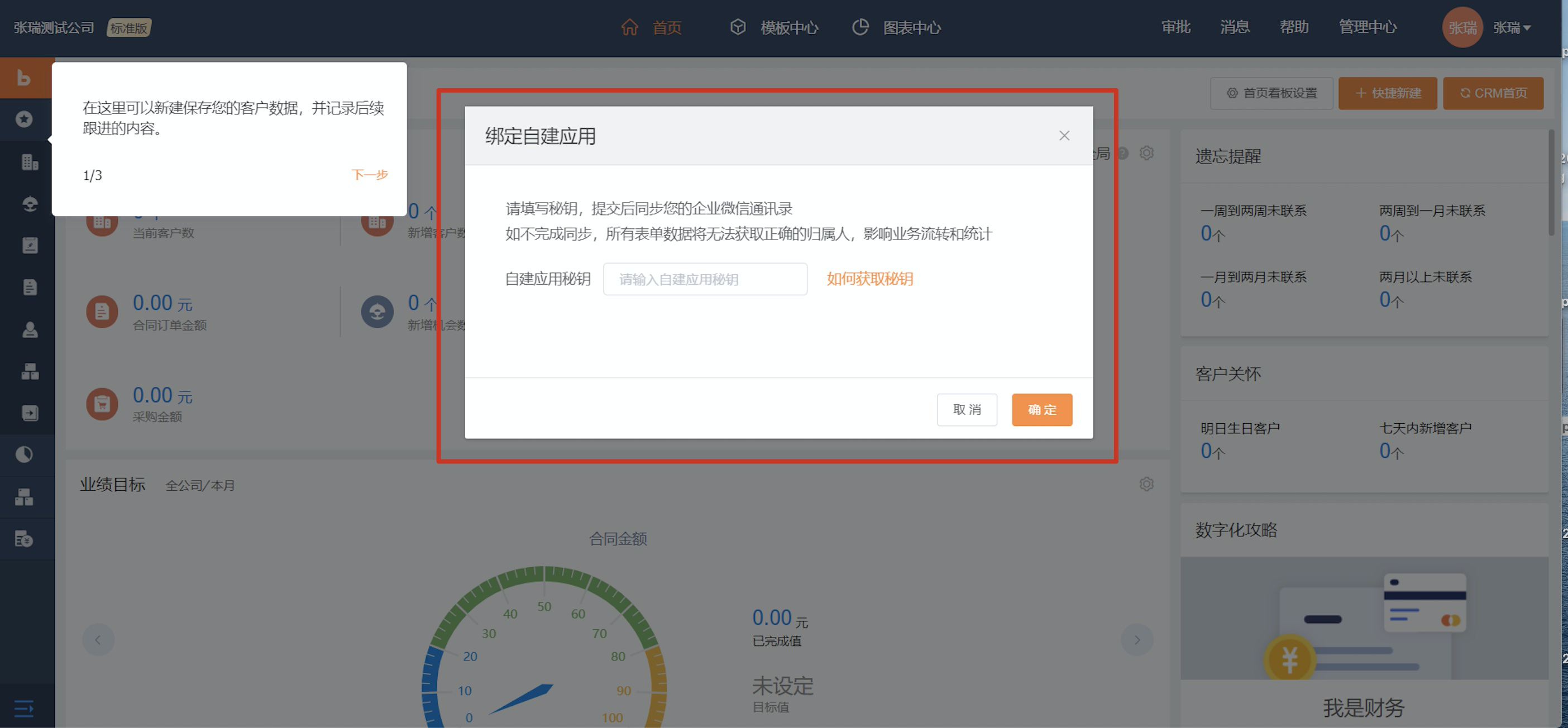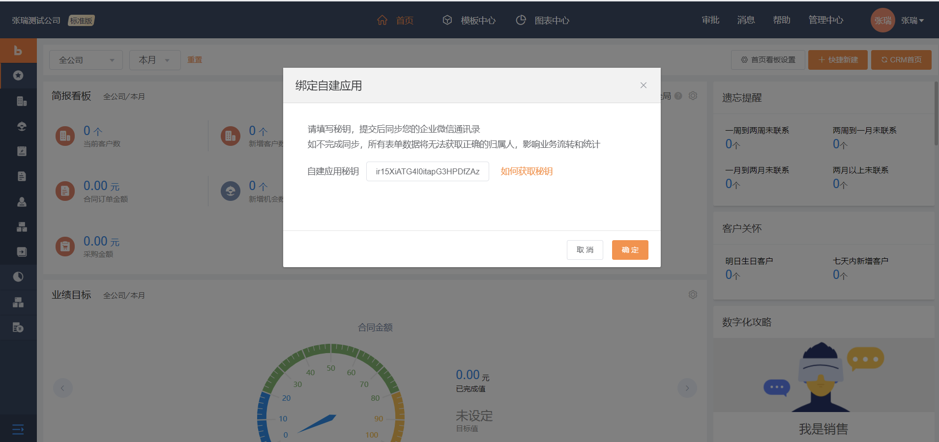 1.绑定自建应用密钥,该步骤只能 企业微信管理员或客户企业里第一个使用企业微信打开销帮帮的人操作。