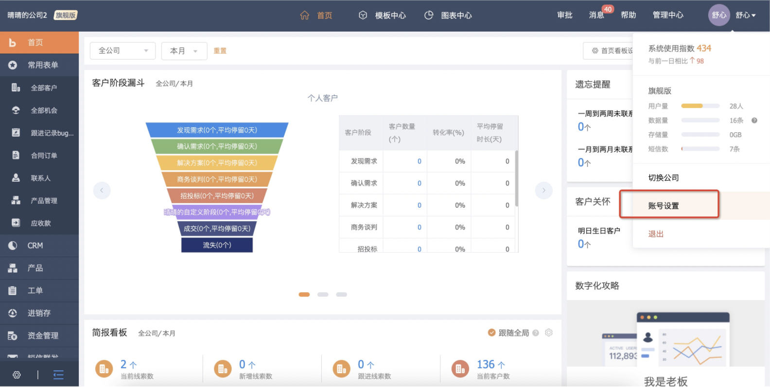 1.点击首页的个人姓名,在弹框里选择“账号设置”