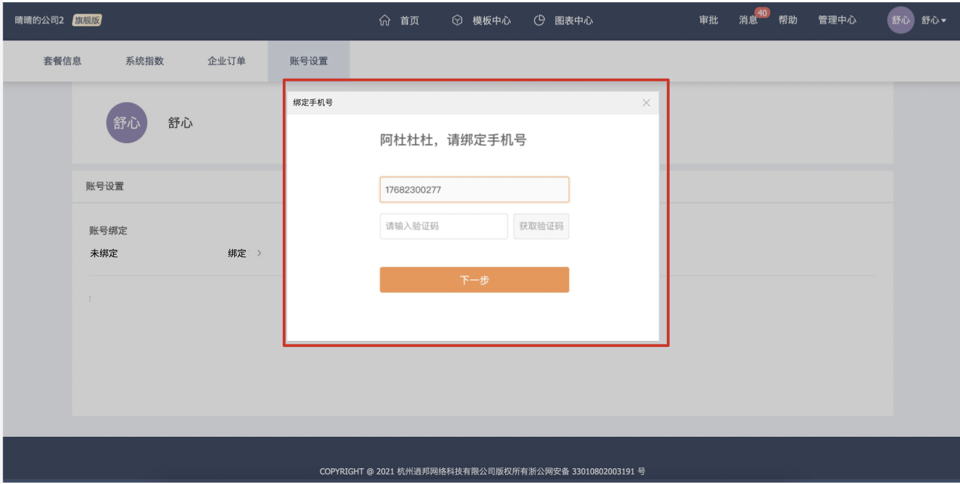 3.在“绑定手机号”弹窗中,输入手机号与验证码后,点击“下一步”