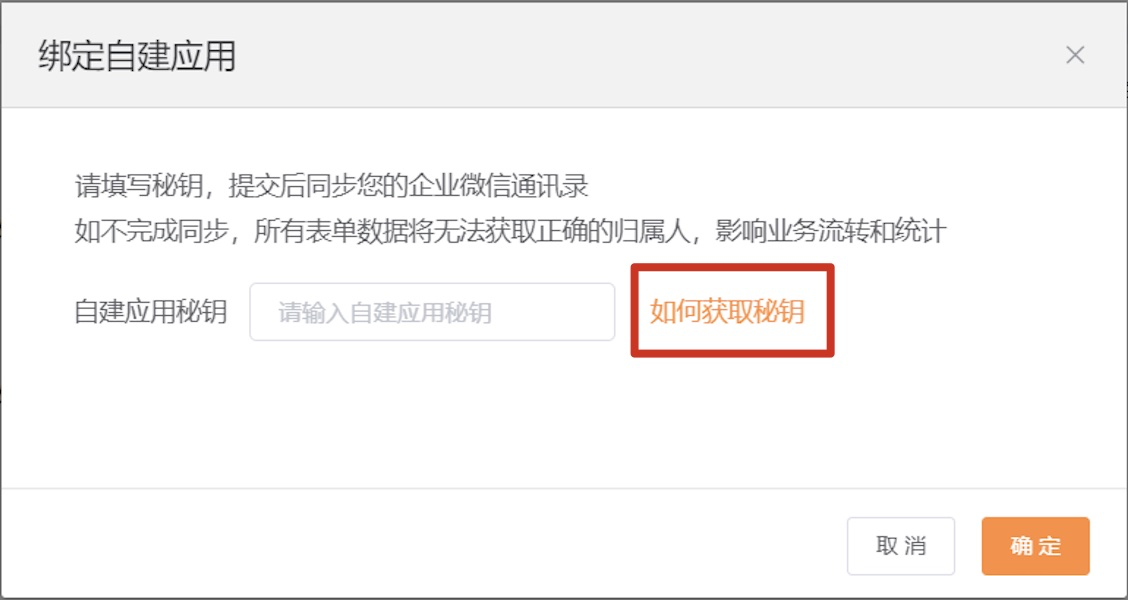 (3)获取后在“绑定自建应用”弹窗内填入密钥,点击确认按键。