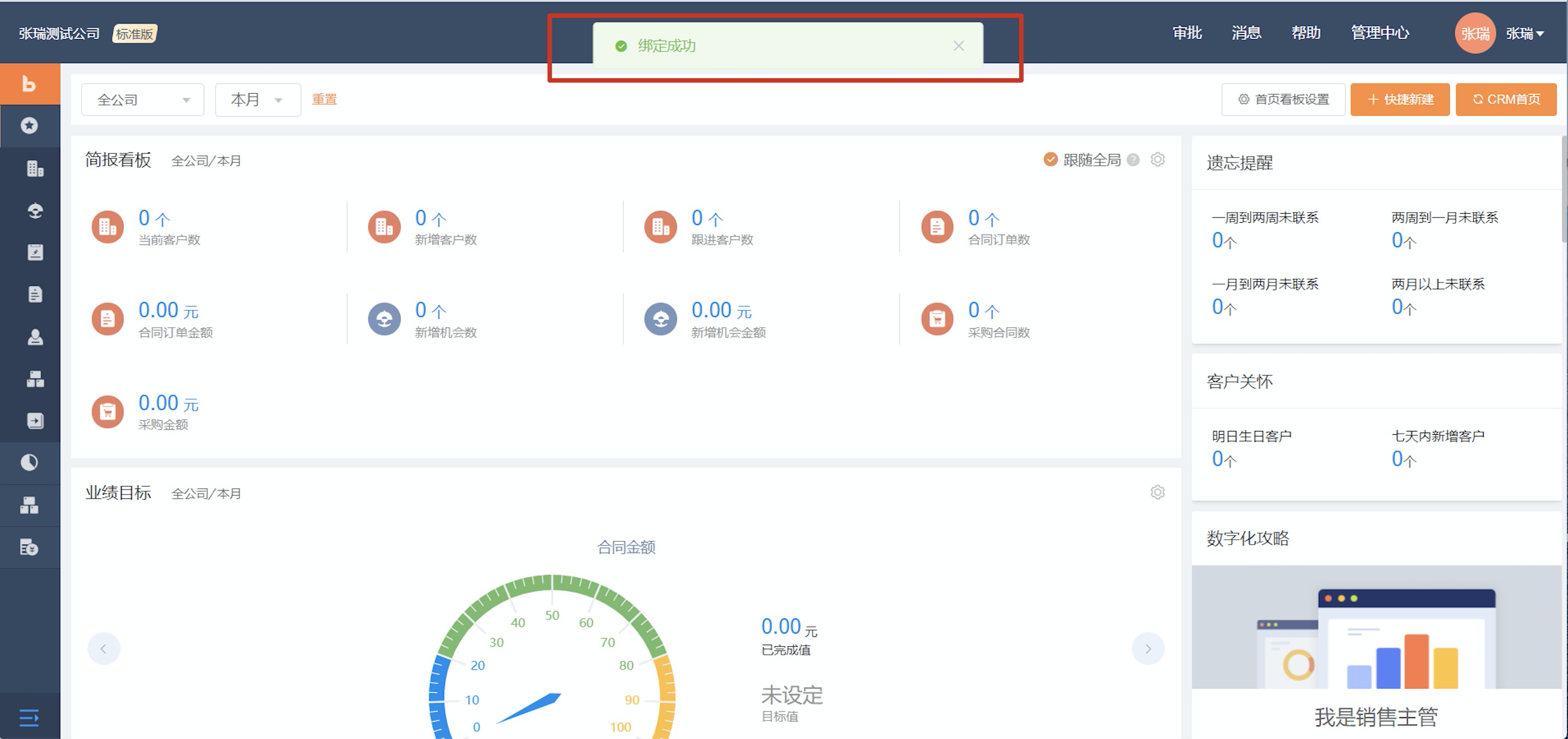 (4)在输入自建应用密钥,点击确认,如果操作成功,会提示“绑定成功”,即可自动同步企微数据到销帮帮CRM。