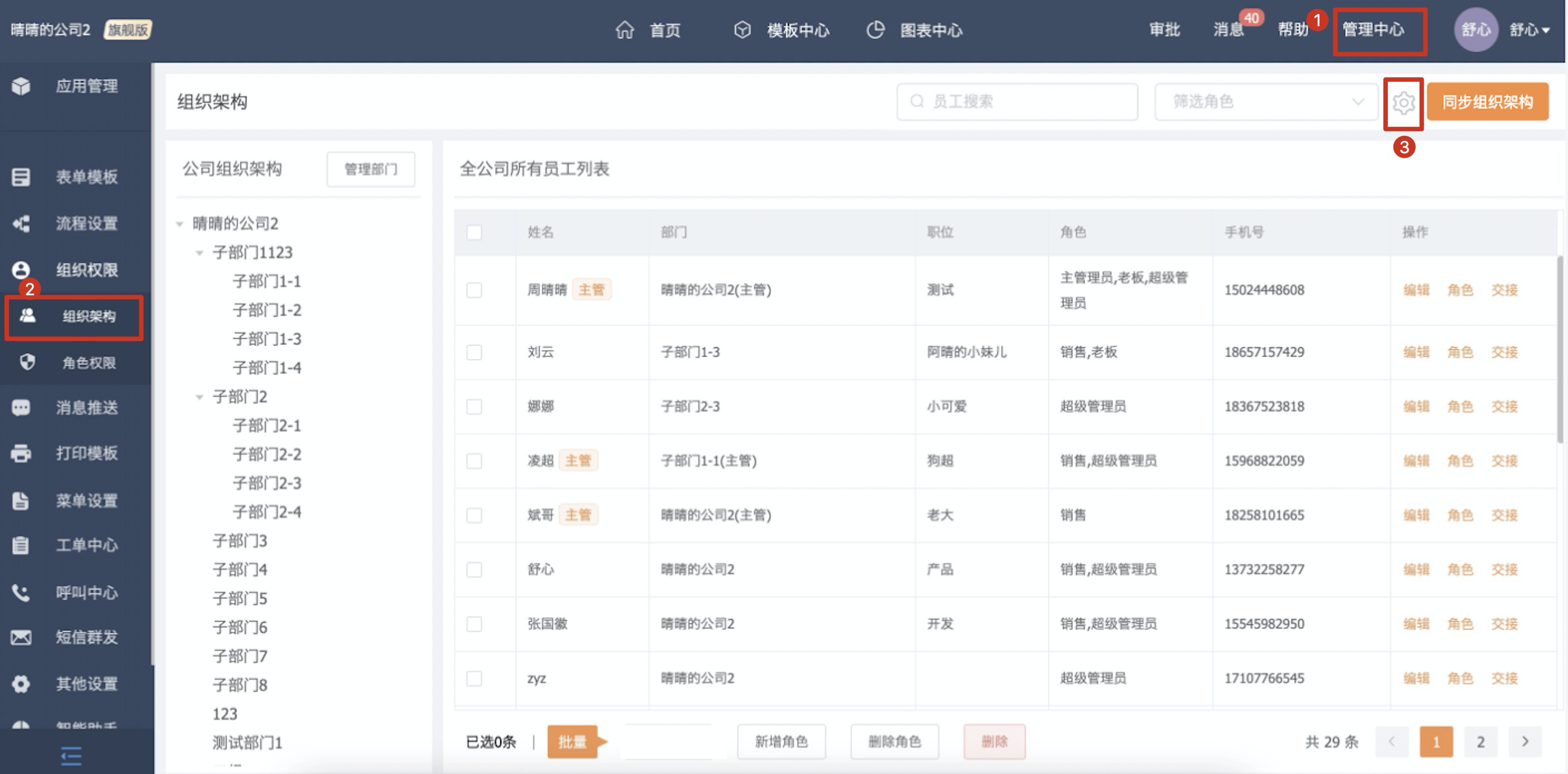 (1)首先,点击右上角“管理中心”,在管理中心左侧边栏的中选择“组织权限”里的“组织架构”;然后点击“齿轮”图标