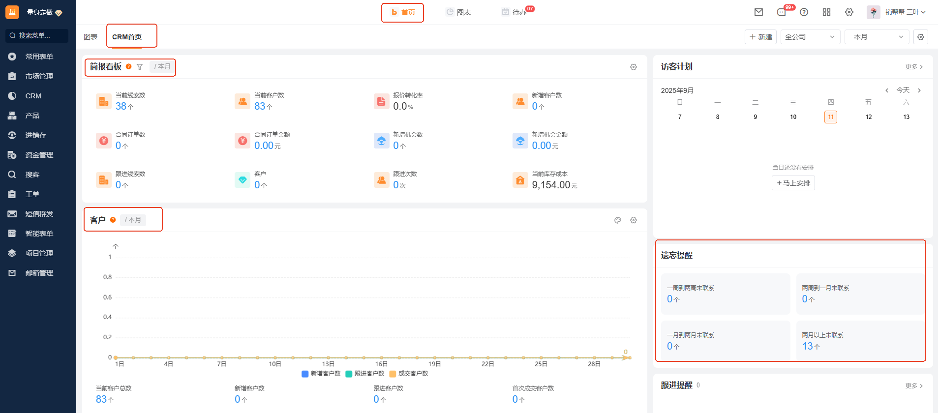 图表位置 | ● 首页 –> 遗忘客户提醒 –> 一周到两周未联系、两周到一月未联系、一月到两月未联系 |