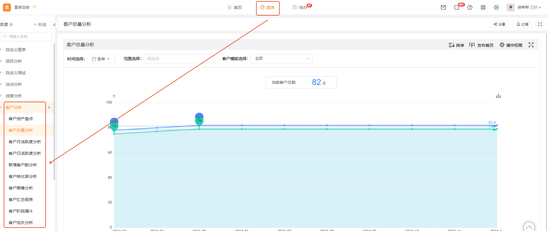 图表位置 | ● 首页 –> 简报看板[当前客户数]、客户模块[当前客户总数] ● 图表中心 –> 客户分析 –> 客户总量分析、客户汇总报表 |