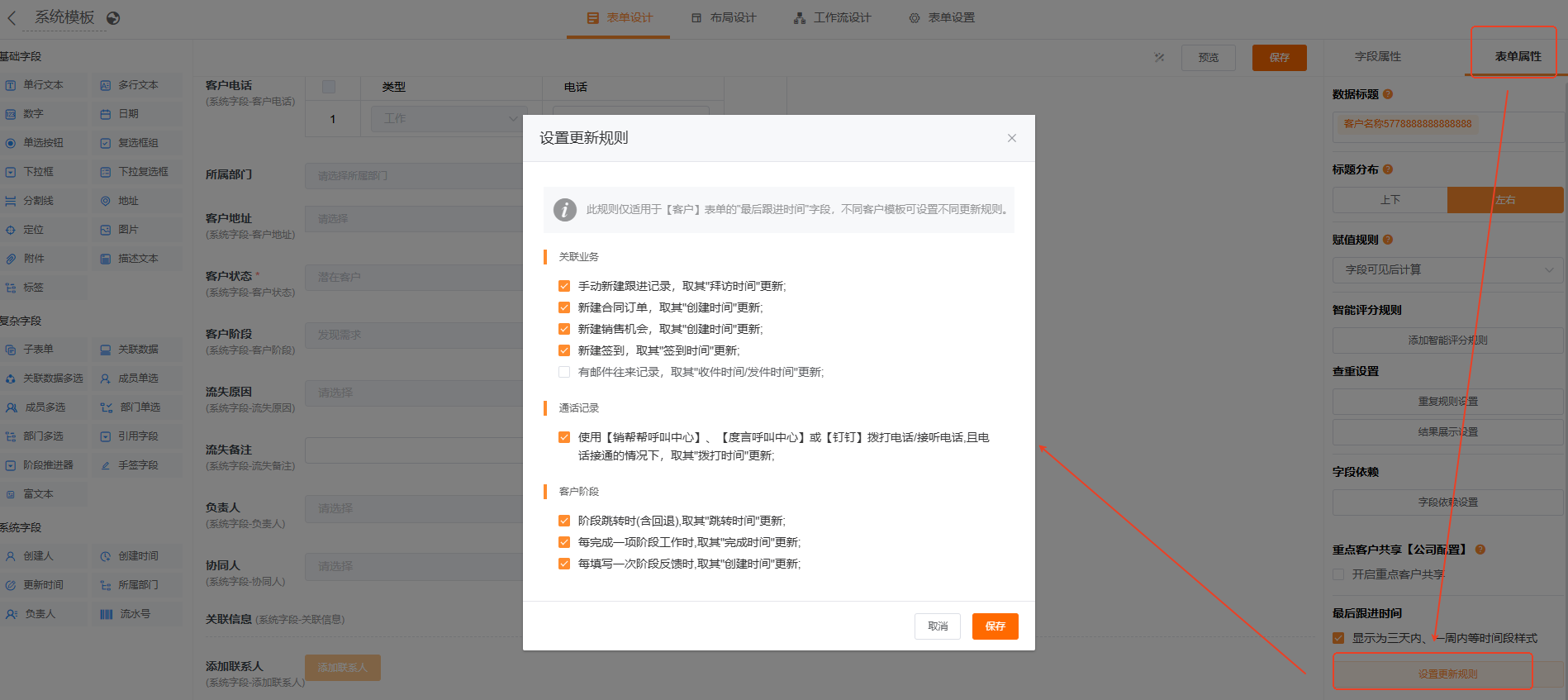 ● 注:影响客户最后跟进时间的操作需要通过表单设计内进行设置