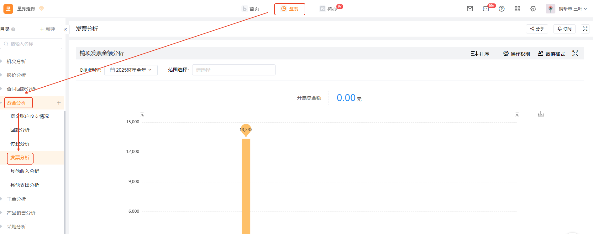 图表位置 | ● 首页 –> 资金管理模块[销项开票]等 ● 图表中心 –> 资金分析 –> 发票分析[销项发票金额分析] |