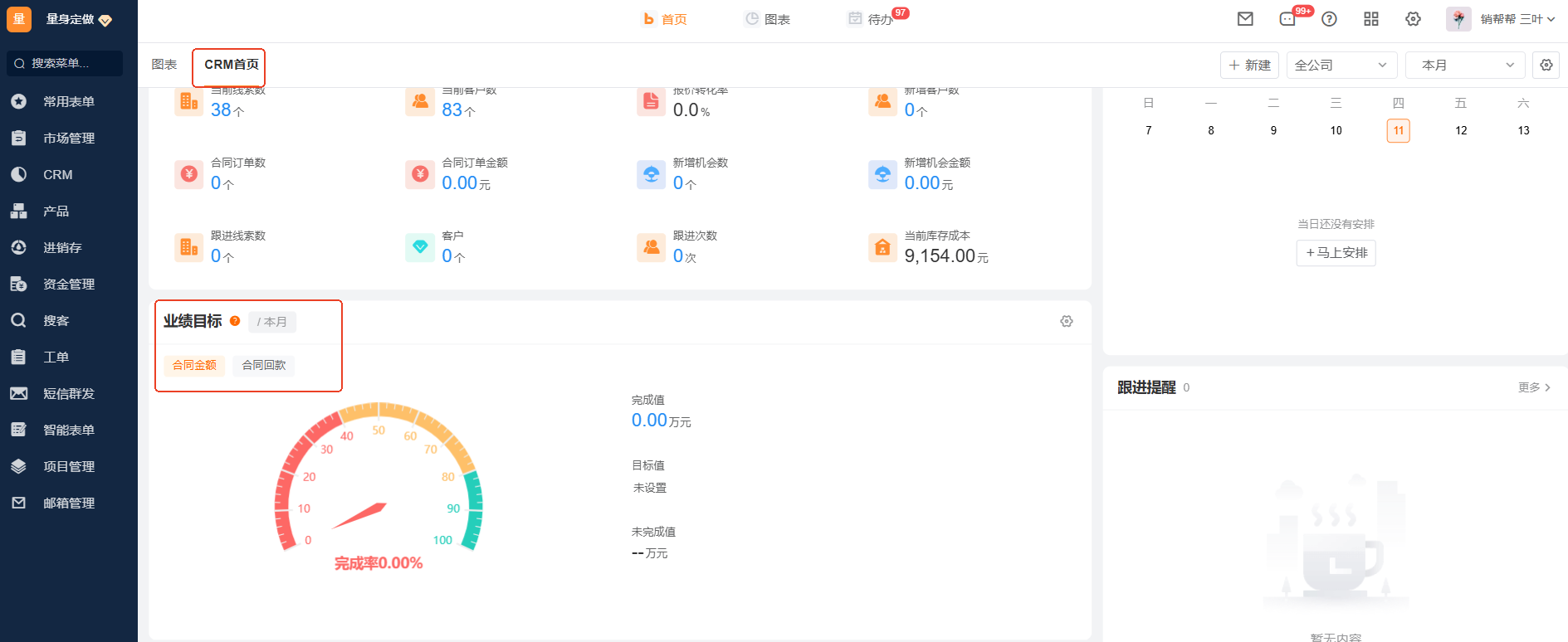 ● 系统目标:系统默认提供的,完成额计算规则制定好的目标,当前有11个,存贮在tb_chart表。其中 ○ 金额类4个:合同金额,合同回款,新增机会金额,合同毛利。 ○ 小数值类1个:产品销量。 ○ 整数值类6个:签约合同数,新增客户数,新增联系人数,跟进次数,跟进客户数,新增机会数。 |
