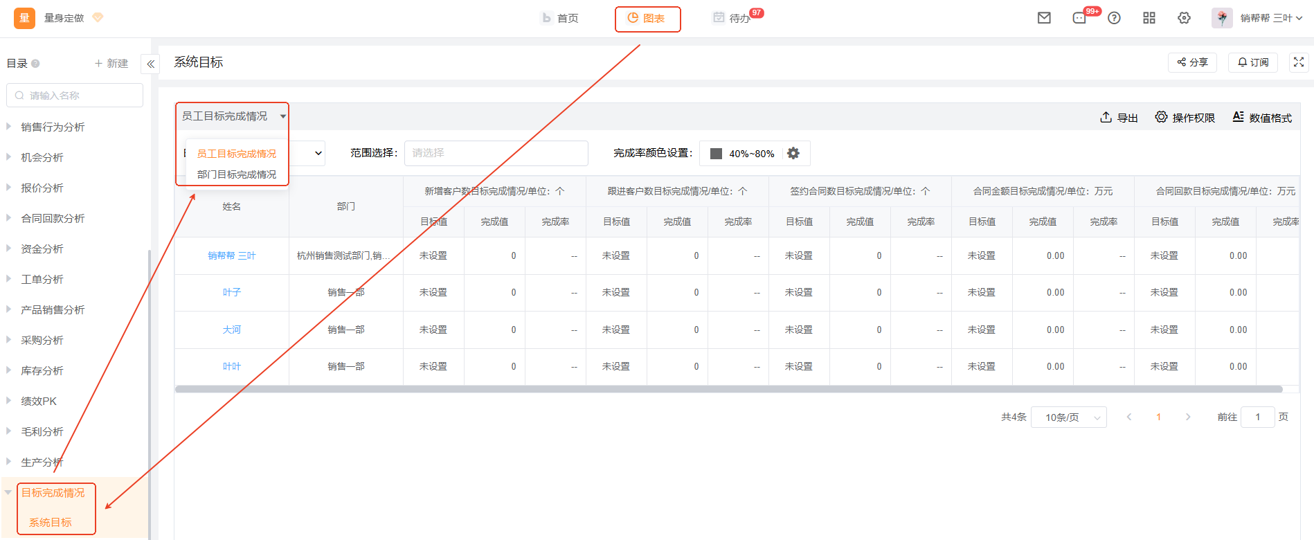 图表规则 | ● 计算方式: 求和(完成值和目标值)以及除法(完成率)。 ● 时间选择: 可以选择时间范围来统计员工或者部门业绩目标的完成情况。 ● 范围选择: 选择参与参与目标统计的员工或部门。 ● 数据格式: 可以选择单位展示。 |