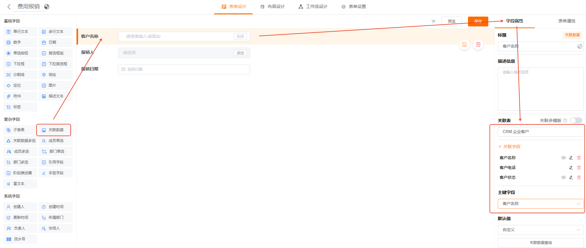 (1)我们自定义一张【费用报销】表单,里面添加一个「关联数据」字段命名为「客户名称」;关联我们的【企业客户】表单,并且设置其他需要的字段;