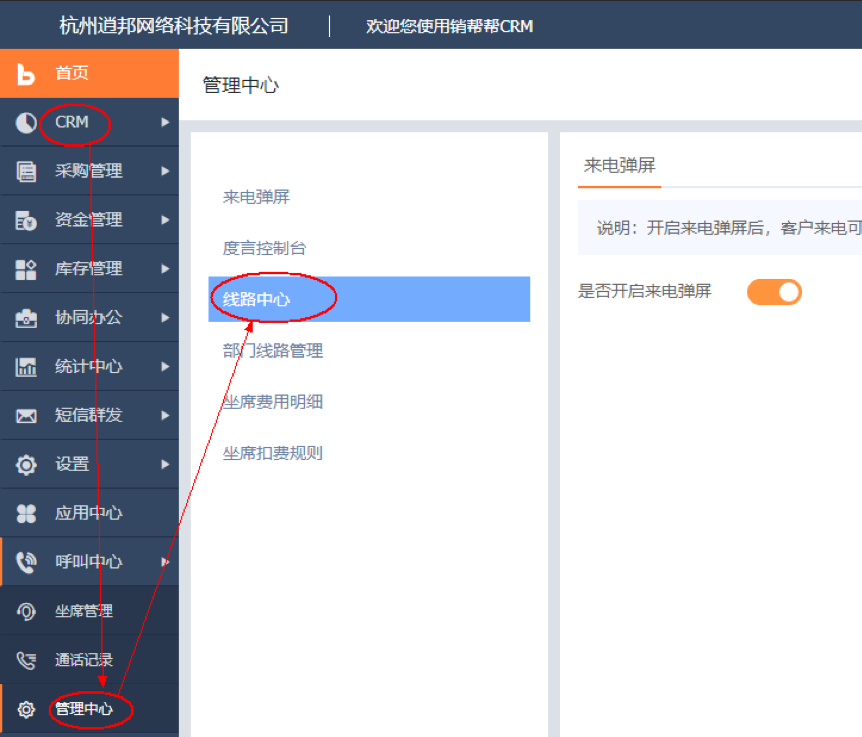 完成第二和第三步骤以后,需要登录销帮帮系统,给各部门分配线路(此处随机线路设置,后期可以换),先点击一次CRM菜单中的客户管理,才会出现呼叫中心菜单。