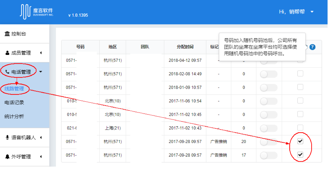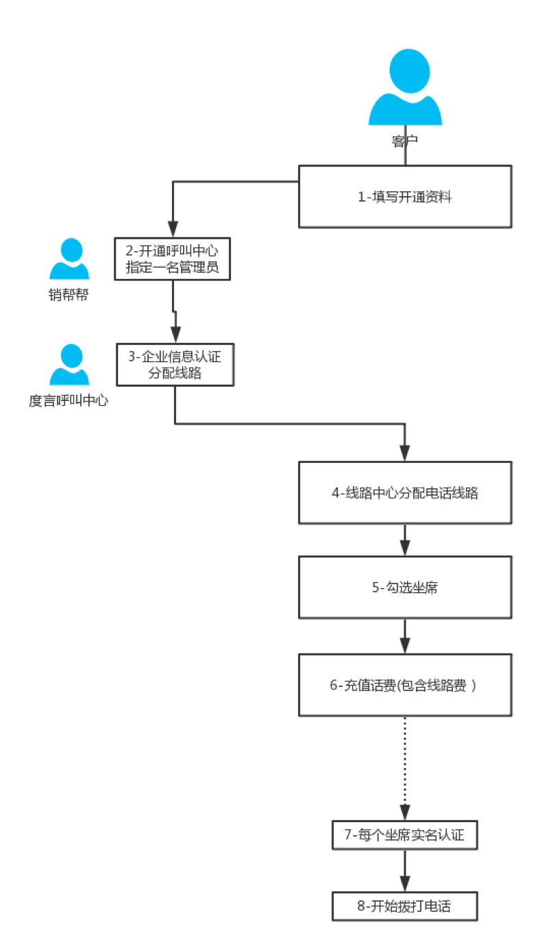 度言呼叫中心,根据开通资料登记表,审核信息,并开通分配线路,添加到客户帐号中,添加完成后会在专属群中通知贵公司对接人,注意:此步骤度言专员会操作完成,无需自行操作