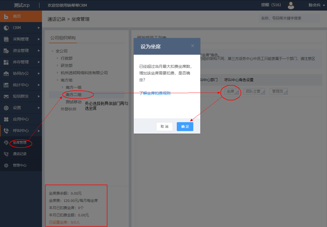 勾选坐席,务必选择到具体部门再勾选坐席,否则销帮帮和度言两边的部门会不一致,第一次勾选坐席的时候会提示你费用超出,这是正常现象,因为每一个坐席都还未付费。