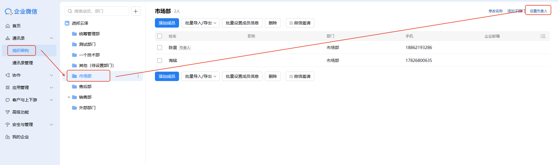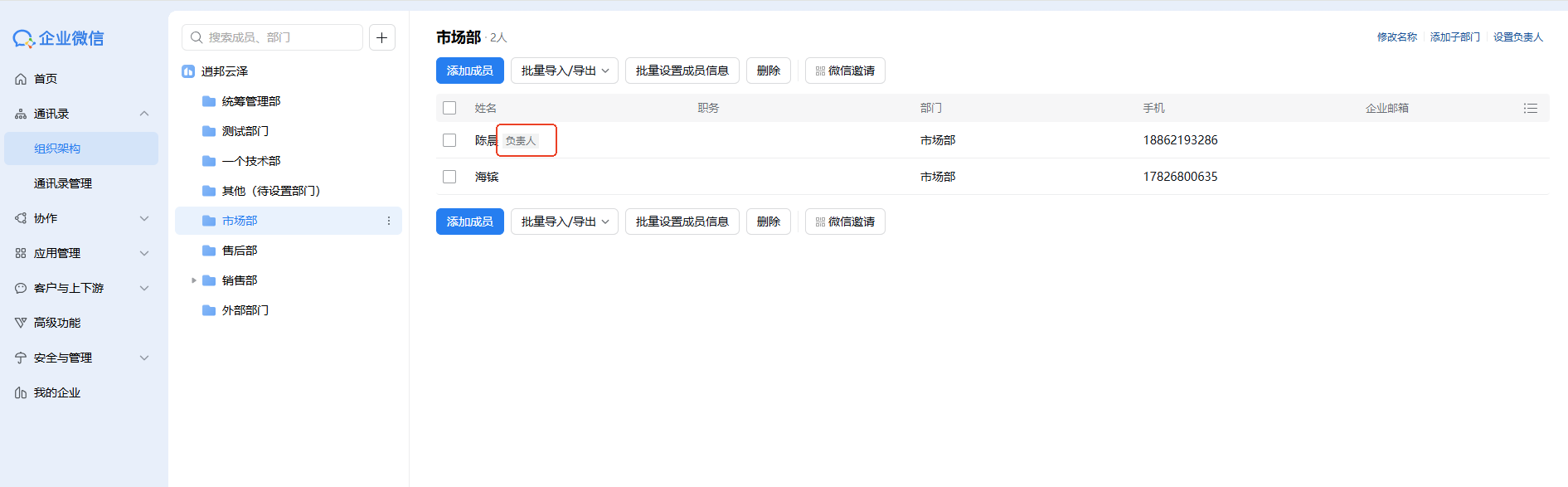 主管为什么看不到员工数据? Q:为什么主管看不到员工数据? 情况1:我们给了销售主管权限,但是主管看不到员工数据; 情况2:在审批中我们可以设定1级主管,2级主管等;这个主管是如何鉴定和设置的? 在【角色权限】中,数据权限为「本部门」、「本部门和下属部门」,或则在审批中我们可以设定1级主管,2级主管等。针对于这些设置生效的前提是我们需要在企业微信组织架构(https://work.weixin.qq.com/wework_admin/loginpage_wx?from=myhome)中设置好主管。 点击部门 》编辑 》设置主管 ,设置完成以后在对应人员旁边会出现「负责人」字体。 何为1级主管、2级主管、顶级主管等? 我们刚刚已经学会了设置主管,那么如何理解1级主管、2级主管、3级主管、顶级主管等? 「1级主管」:本部门主管; 「2级主管」:上级部门主管; 「3级主管」:上上级部门主管; 以此类推 「顶级主管」:组织架构最顶层主管;例如:华东区的A成员,她的一级主管为(华东区)的主管 二级主管为上级部门主管(销售部),三级主管为上上级部门主管(逍邦云泽)