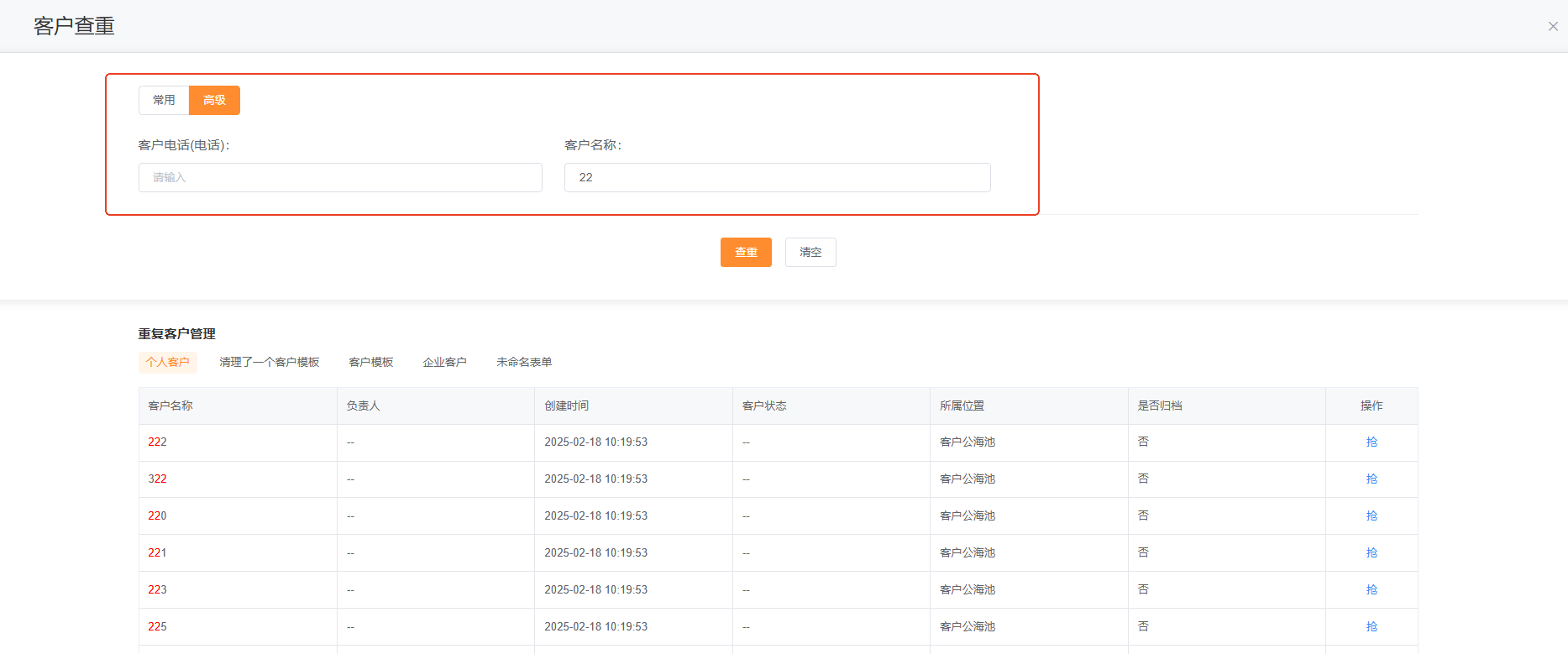 为什么提示“客户名称值存在重复”或者提示“电话值存在重复” Q:为什么新建客户时提示“客户名称值存在重复”或者提示“电话值存在重复”? 如果录入系统时提示客户名称存在系统,但是在全部客户中无法搜索到客户,我们可以通过查重进行查看客户所在位置 主要字段: 负责人:当前客户的负责人,如果负责人是其他人,表示客户在其他人账号下; 所属位置:客户在哪个列表;「客户列表」表示在CRM 》客户管理 》全部客户中;「公海池客户」表示在CRM 》客户管理 》客户公海池中;审批列表表示在首页 》审批中; 表单名称:表示客户在哪张表单的数据中,客户存在多模版情况,需要到对应表单中查询; 是否归档:显示“是”,需要到已归档中查看;显示“否”,需要在未归档查看请参考:【是否归档设置参考】