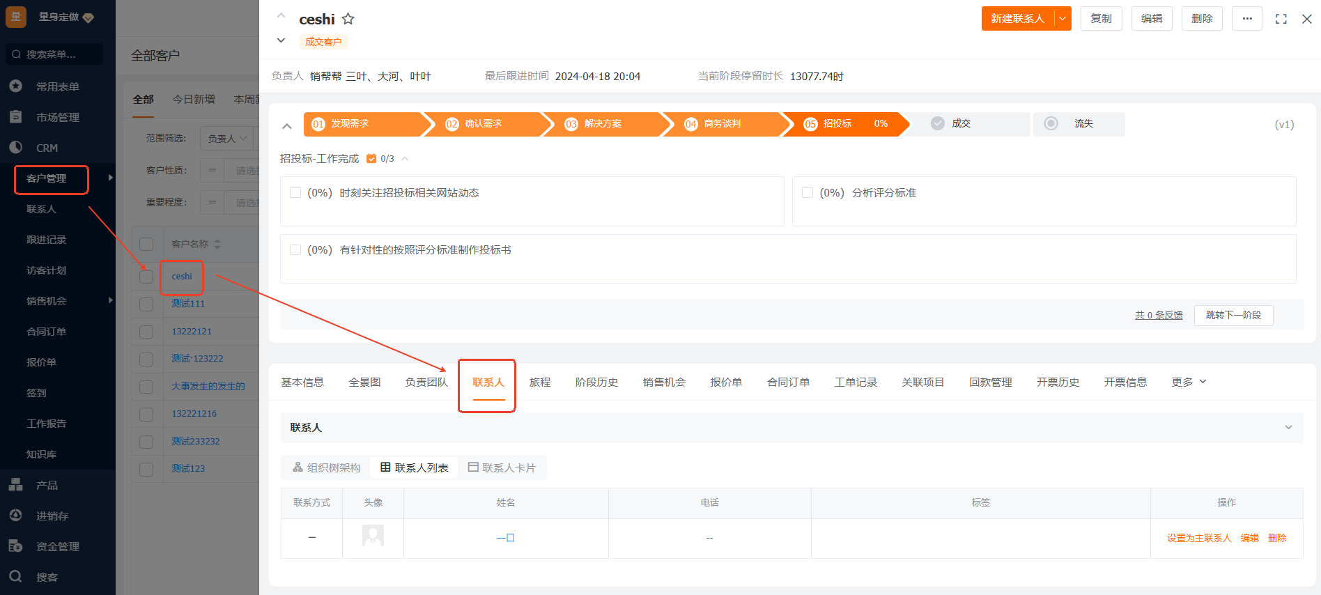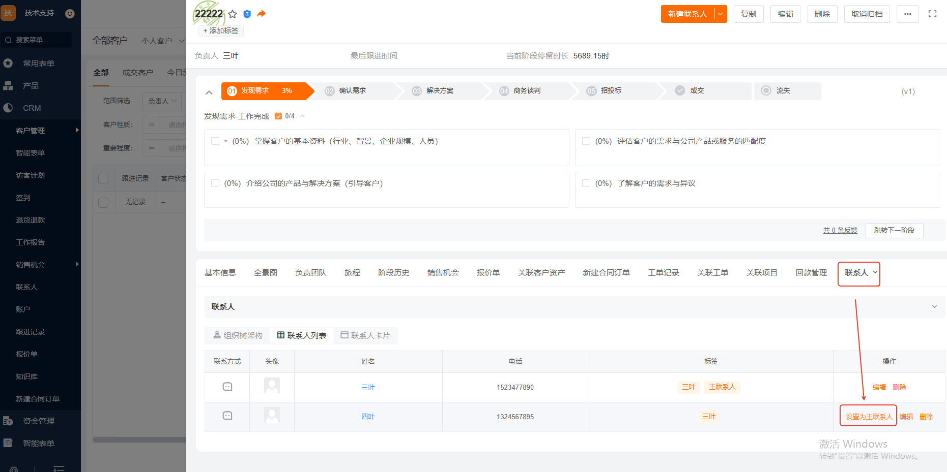 主联系人是什么意思?有什么作用? Q:主联系人是什么?有什么作用?如何设置主联系人? 联系人:对企业客户而言:客户名称就是法定公司名称,跟客户相关的其他人员,譬如您的业务员跟进的客户是公司的部门主管、财务、行政等,那这些就是客户的联系人,主联系人:客户的多个联系人中最重要的一位就可以设置为客户的主联系人。设置了主联系人可以在客户列表页显示主联系人的姓名和电话,可以更快捷联系客户联系人;不设置主联系人的话,第一个新建的联系人默认为客户的主联系人新建联系人两个入口:a.新建客户的界面可以直接添加联系人b.新建完成的客户,点击客户详情添加联系人 设置主联系人的步骤如下图: 客户列表页主联系人的显示如下: