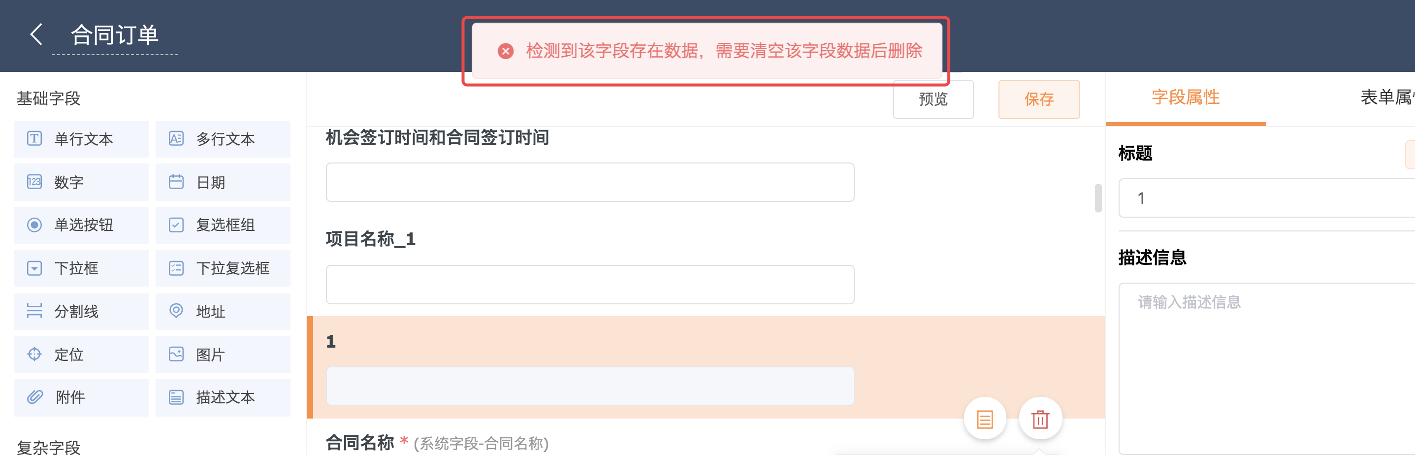 由于在首页对应模块的表单里面已经录入该字段数据,为了防止误删除导致的数据丢失情况,我们将会提示“检测到该字段存在数据,需要清空该字段数据后删除”;
