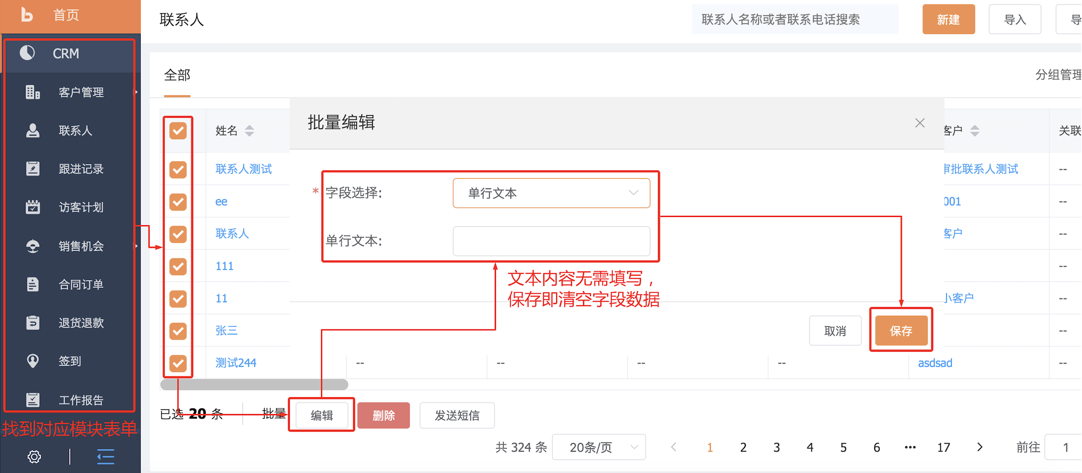 方法1.如果需要删除的字段类型是单行文本、数字、多行文本、日期、下拉,可以到列表页进行批量清空;