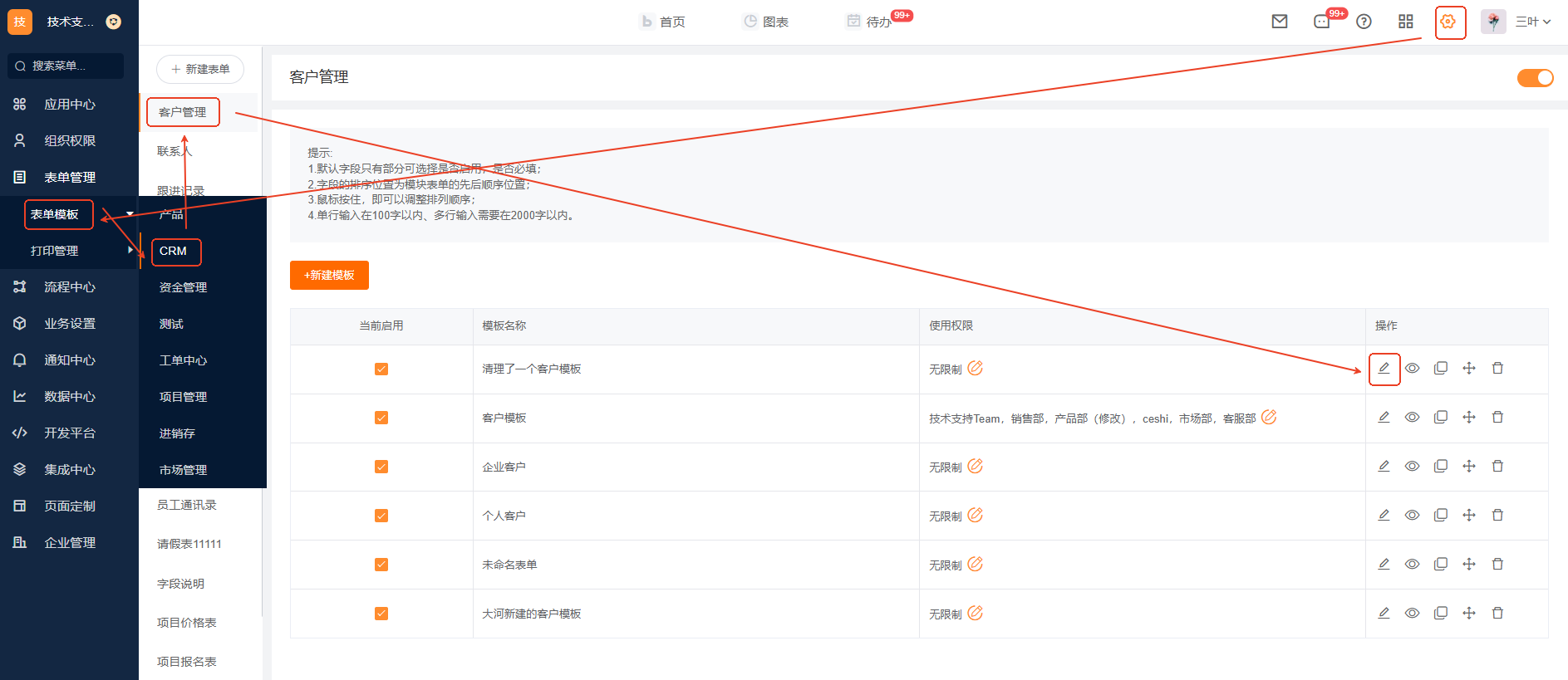 客户电话的「类型」字段如何修改? Q:客户电话的「类型」字段如何修改? 如果需要修改客户电话中的「类型」字段信息,可以到 管理中心 》表单管理 》表单模版 》CRM 》客户管理 》编辑,点击类型字段修改或则添加。