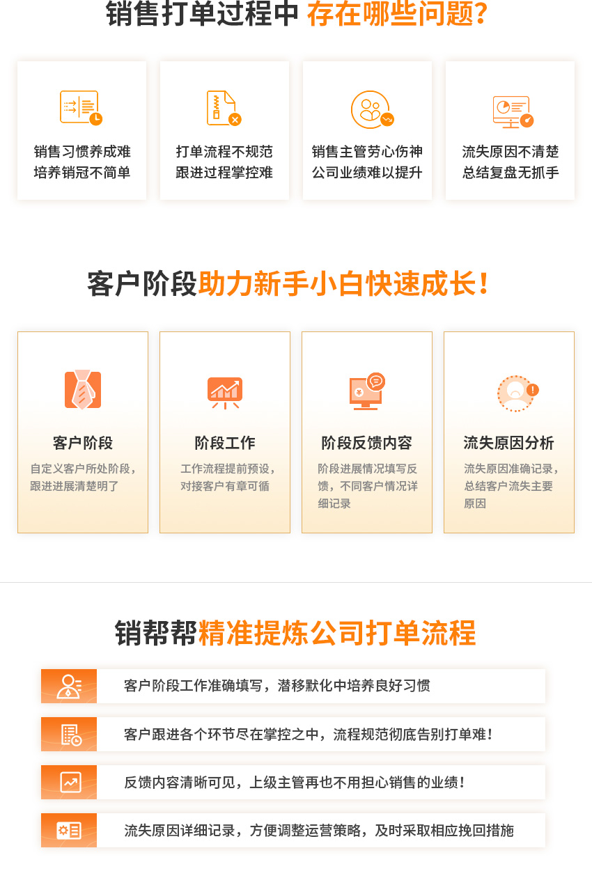 成为销冠不是梦,销帮帮带你飞 销售习惯养成难,培养销冠不简单 打单流程不规范,跟进过程掌控难 流失原因不清楚,总结复盘无抓手 销售主管劳心伤神,公司业绩难以提升 客户阶段工作准确填写 ,潜移默化中培养良好习惯;流失原因详细记录,方便调整运营策略,及时采取相应挽回措施!